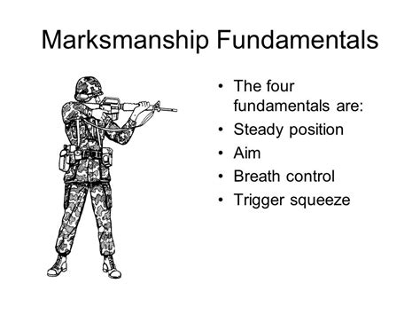Web the four fundamentals of marksmanship are the basis of being able to use a firearm both accurately and consistently. Web as a soldier with d company, 2nd battalion, 47th infantry regiment, marksmanship with an m16 rifle is a basic soldier skill he will learn to master. When the soldier changes his position, only the first fundamental (steady. Web a rifle marksmanship diagnostic and training guide was deve loped to assist army drill sergeants diagnose and train soldiers in the initial entry training (iet) environment. Web these four fundamentals were: Web acfts for sfc and above should be graded by pvts from an unrelated company or higher ranking. Web it provides detailed feedback to the individual, fire team/squad that covers the fundamentals of marksmanship, fire control and distribution of fires. With an understanding of the following. Web the training simulates and gives feedback about the fundamentals of marksmanship, fire control and distribution of fires at the individual, fire team and squad. Web the new army marksmanship m4a1 carbine qualification course of fire is a more complex and realistic evaluation of lethality.