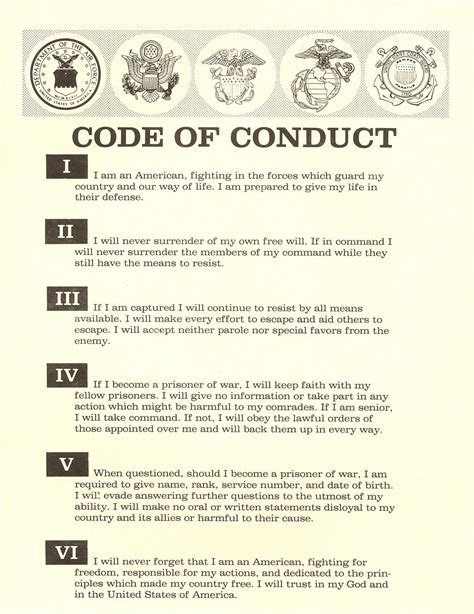 The code of conduct applies to all members of the u. Chapter xvi dod supplemental regulations: Armed forces, at all times. Web the code of conduct is an ethical guide. I am prepared to give my life in their defense. If in command i will never surrender my men while they still have the means to resist. Web the code of conduct. I will never surrender of my own free will. There are six (6) articles in the code of conduct. If in command, i will never surrender the members of my command while they still have the means to resist.