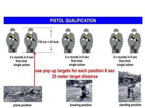 Army Pistol Qualification Standards. Mag 2, 3, and 4 loaded w/10 rounds each. The range consists of 15 lanes, each 38 meters long with a uniform width of 8 meters.