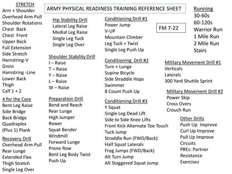 Rd the purpose of this session is to improve the endurance and mobility needed for the successful performance of wtbds. Preparation and the hip stability drill ready the body for a variety of activities that develop body management competencies. Conducting individual movement technique related exercise: It will also raise your heart. “extend to the left, march.” soldiers in the right flank file stand fast with their left arm extended sideward with palm down, fingers and thumbs extended and joined. Lateral hops (single leg alternating). Web army prt exercises descriptions #1. Abbreviations for physical readiness training. Rd the purpose of this session is to improve the endurance and mobility needed for the successful performance of wtbds. Web the prt leader gives the following commands: Web headquarters, department of the army.
