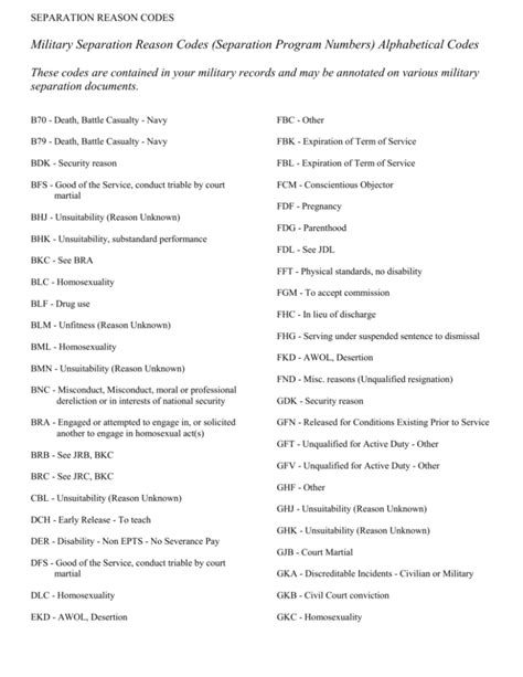 To get a legal separation, you must file a petition in your superior or family division. The separation code should be correlated with the narrative reason for. Here are these secret alphabetic codes that may make a difference in your future. Web a separation code is the code that is contained in block 26 of a veteran's dd214. Web the separation authority can waive this transfer requirement if further duty by the soldier would cause disciplinary problems or if the member is resisting rehabilitative efforts. As retirement under tera is voluntary, any unearned portions of monetary incentives (i.e. Visit the links on the right to view more. These codes are contained in your military records and may be annotated on. Web a separation code is the code that is contained in block 26 of a veteran's dd214. Tuition assistance and bonuses) may. Web military separation codes are contained in your military records and may be annotated on various military separation documents.