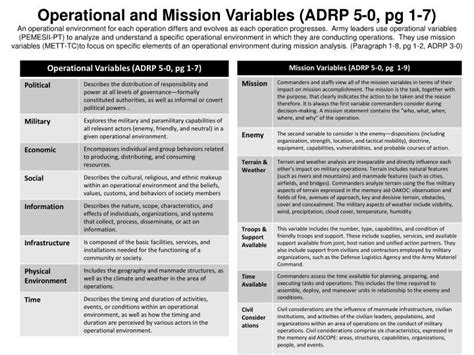 The operational variables provide a means to develop a comprehensive understanding of an operational environment, independent of threat or enemy activity. When infantry forces are alerted for deployment, redeployment within a theater of operations, or assigned a mission, their assigned higher headquarters provides an. The mission variables consist of. Permissive environments, hostile environments, and uncertain environments. Web us army combined arms center Web variables of an operational environment (oe)into army training, education, and leader development.his tc t includes concepts and capabilities (products, services, and support) for the armydeveloped. Web operational variables using army design methodology, as applicable, army planners analyze an operational environment in terms of eight interrelated operational variables: Web operations and recognizes that military operations are foremost a human undertaking. Information collection against each of the operational variables (political, military, economic, social , information, infrastructure, physical environment, There are three types of operational environments: