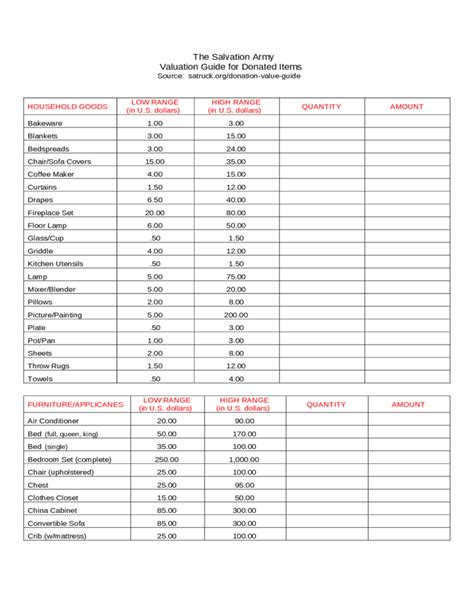 Salvation Army Donation Value Guide 2016 Spreadsheet Printable