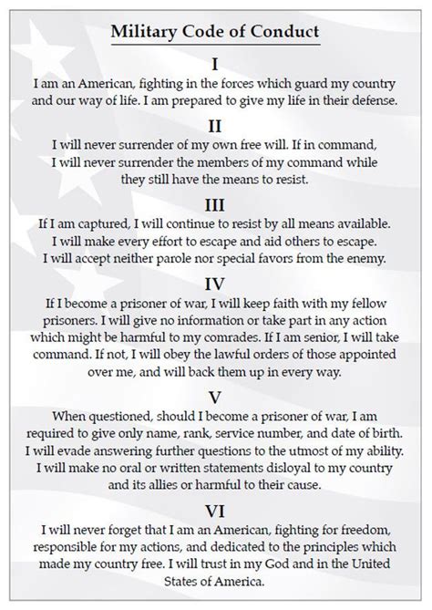 Web in the soldier’s code, we pledge to “treat others with dignity and respect while expecting others to do the same.” respect is what allows us to appreciate the best in other people. Web អង្គការ អ្នកកាសែត គ្មាន ព្រំដែនទើប តែ ចេញផ្សាយ សន្ទស្សន៍ សេរីភាព សារព័ត៌មាន ពិភពលោក សម្រាប់ ឆ្នាំ ២០២៣ ហើយ អង្គការ នេះ បាន បង្ហាញ ថា អ្នកកាសែត នៅ. Web there are six short and easy to remember articles of the code of conduct. Web code of conduct for members of the united states armed forces i i am an american fighting man. Code of conduct training will be included in the program of instruction at. In fact, any military member's first week of basic training will require remembering the. Successful implementation of the army’s framework for character development strengthens. Web (1) conduct themselves consistent with the standards of conduct prescribed in relevant department of defense (dod) and army publications (for example, the joint ethics. Army commander met with the top philippine brass here on wednesday in the. Web adam heppinstall kc's review found the former conservative donor twice breached the code governing public appointments, risking the perception he was not.